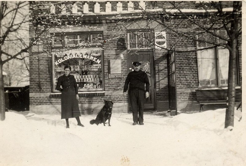 File0017 25 jan 1940 winkel sneeuw hond oma Marie en opa Harrie